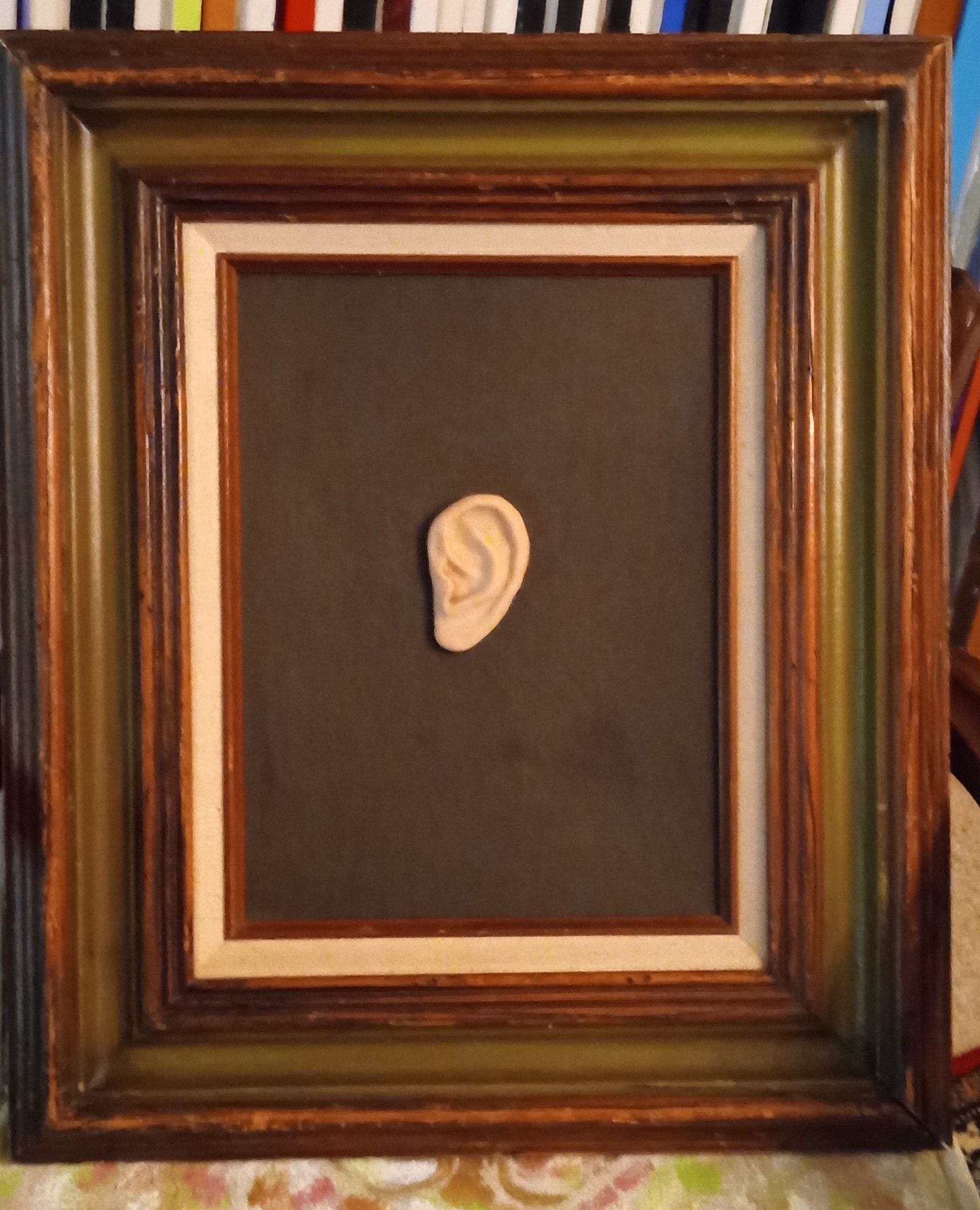 Life size ear Made from clay attached to canvas board in vintage frame. Frame is authentically aged…